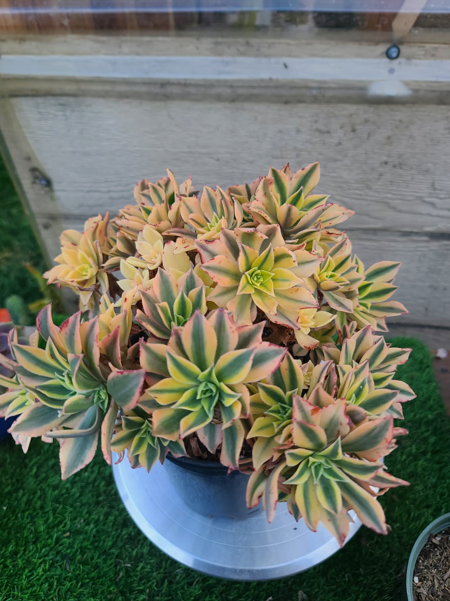 Aeonium ‘Yellow Maple Leaf’ (also frequently known as Aeonium ‘Sunburst’ f. variegated or a specific variegated mutation of the ‘Maple Leaf’ hybrid) is a breathtaking cultivar defined by its vivid contrast and architectural silhouette. It is a must-have for collectors seeking high-impact color.