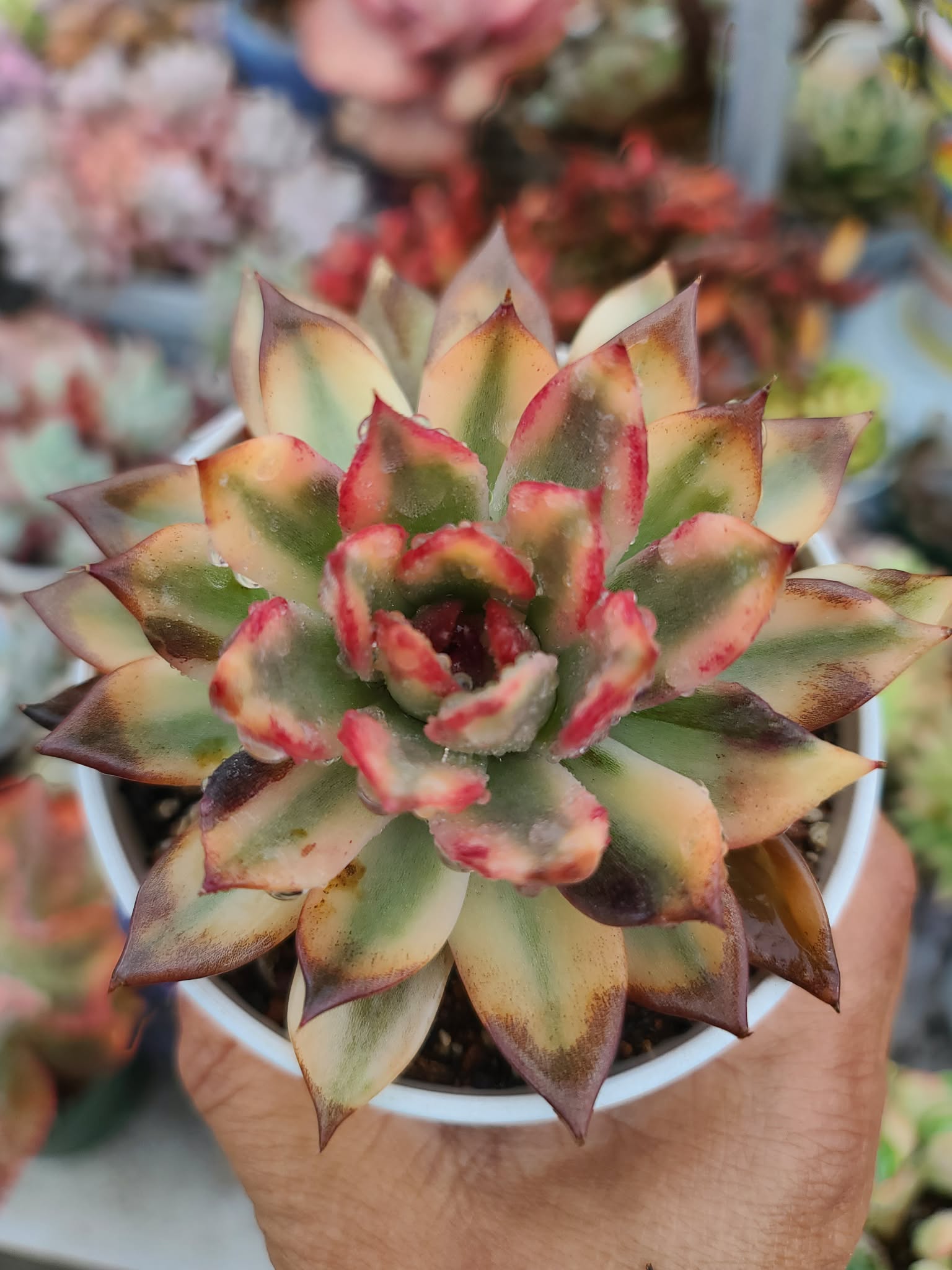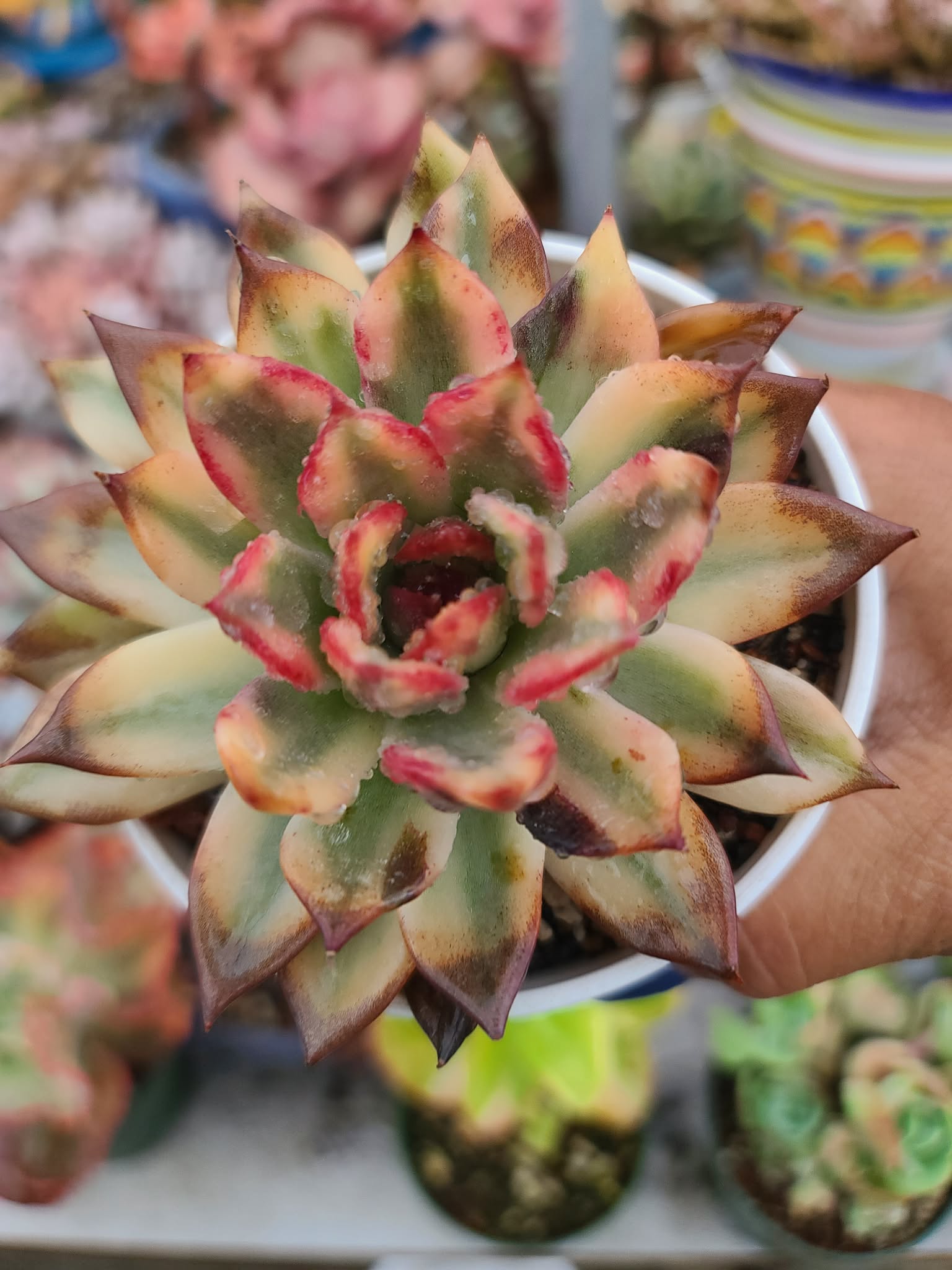Echeveria ‘Downey’ Variegated is a rare and striking cultivar that looks like a hand-painted masterpiece. This variety is highly sought after for its dramatic, pointed leaves and the complex “tiger-stripe” variegation pattern visible in your photo.