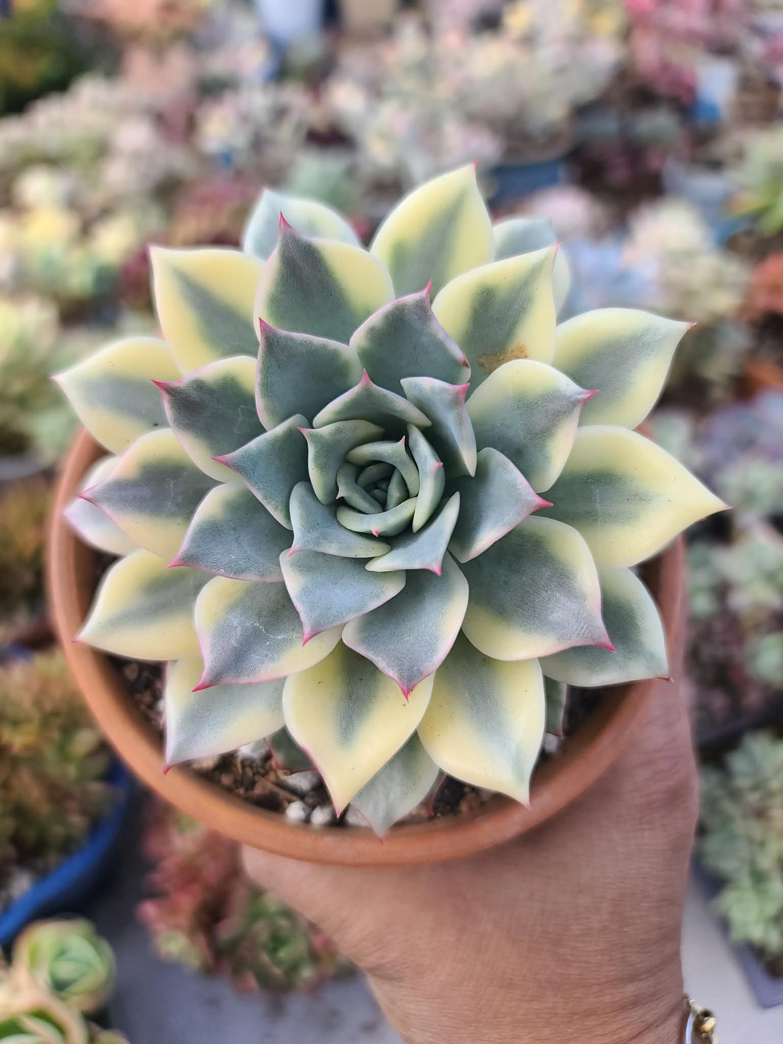 Echeveria halbingeri Variegated is a high-contrast, elite cultivar known for its razor-sharp leaf definition and symmetrical growth. This variegated form features thick, pointed leaves with a deep teal or slate-green center, framed by wide, clean bands of creamy ivory.