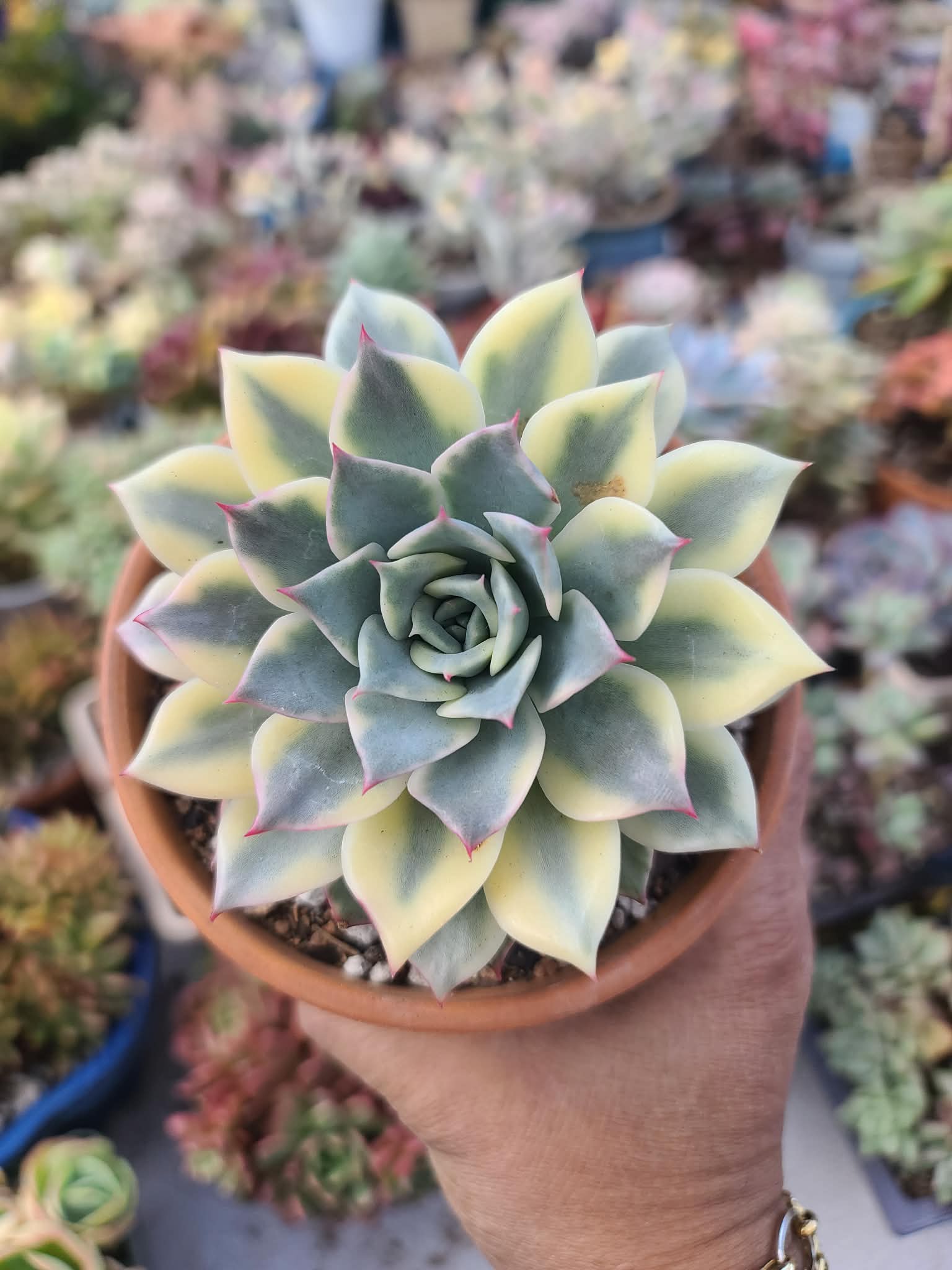 The most striking feature—beautifully captured in your image—is the tiny, vibrant magenta or hot-pink “stinger” tip at the apex of each leaf. These colorful points create a “sparkling” effect against the soft cream and dark green foliage, making it a true collector’s jewel.