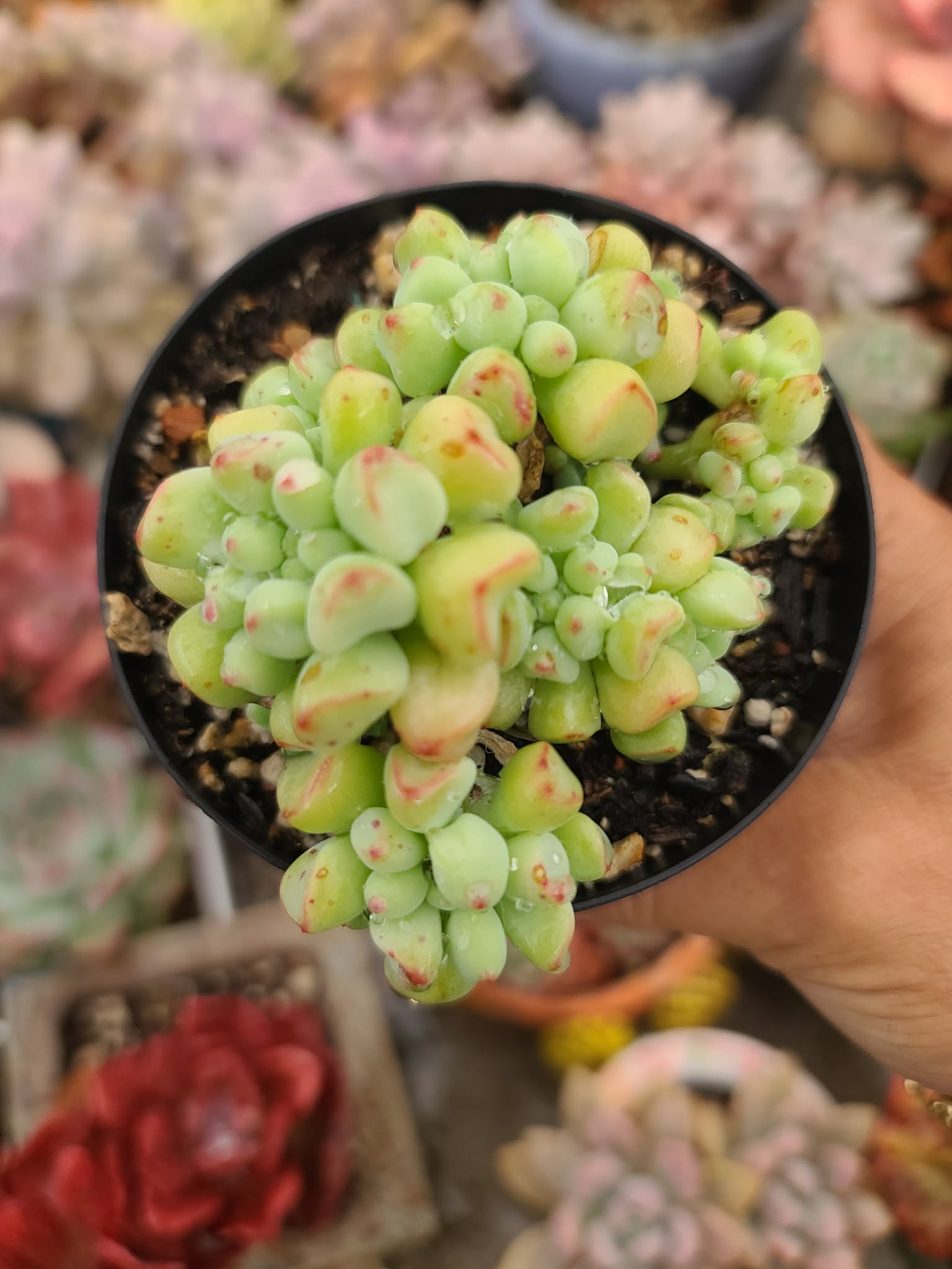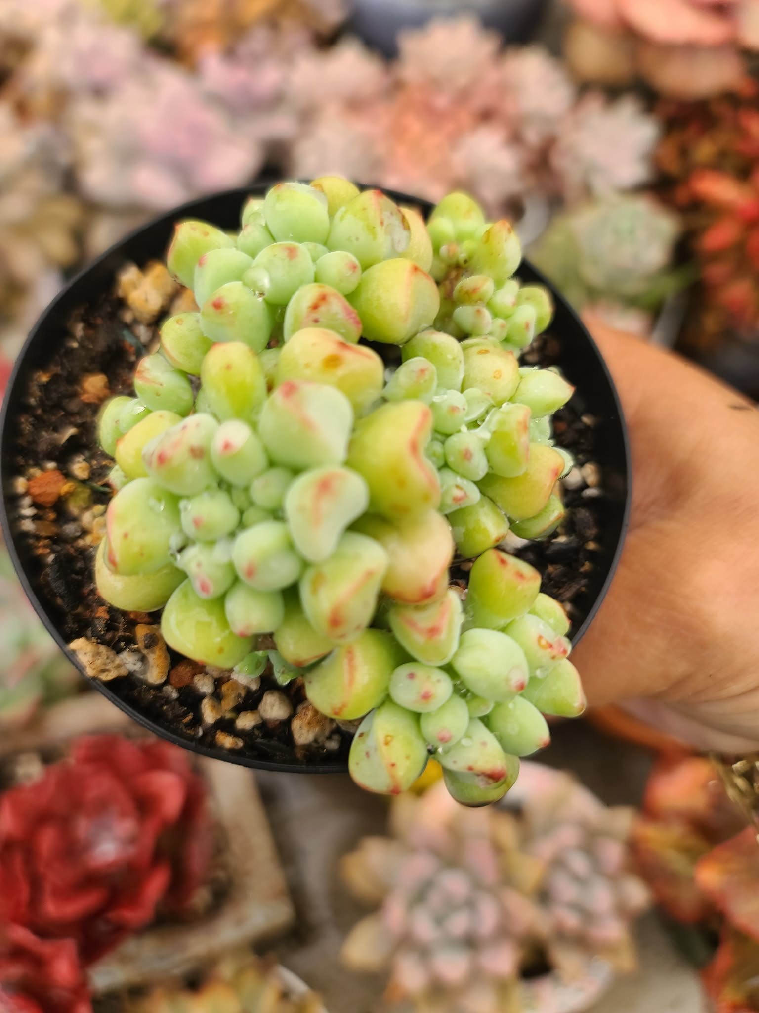 Echeveria Heart Ball is a cute, compact succulent with plump, rounded leaves that resemble tiny hearts. Its soft green tones with subtle pink tips give it a sweet, playful look—perfect for adding charm to any collection.