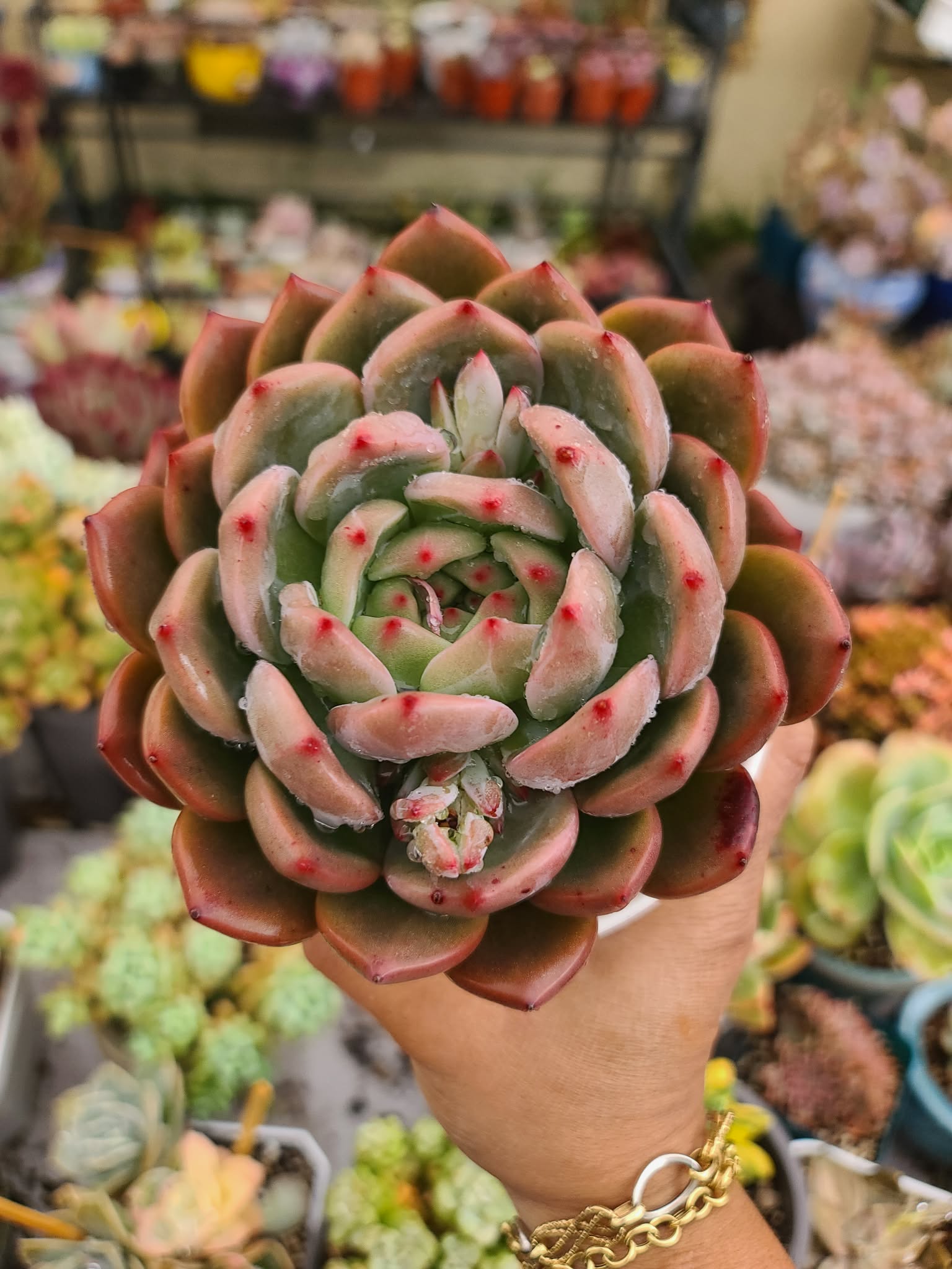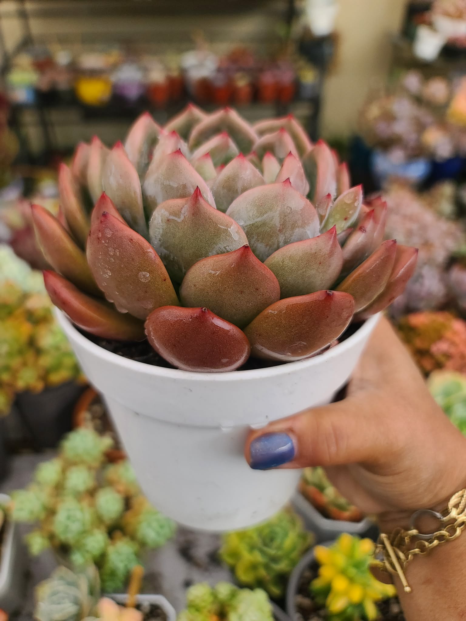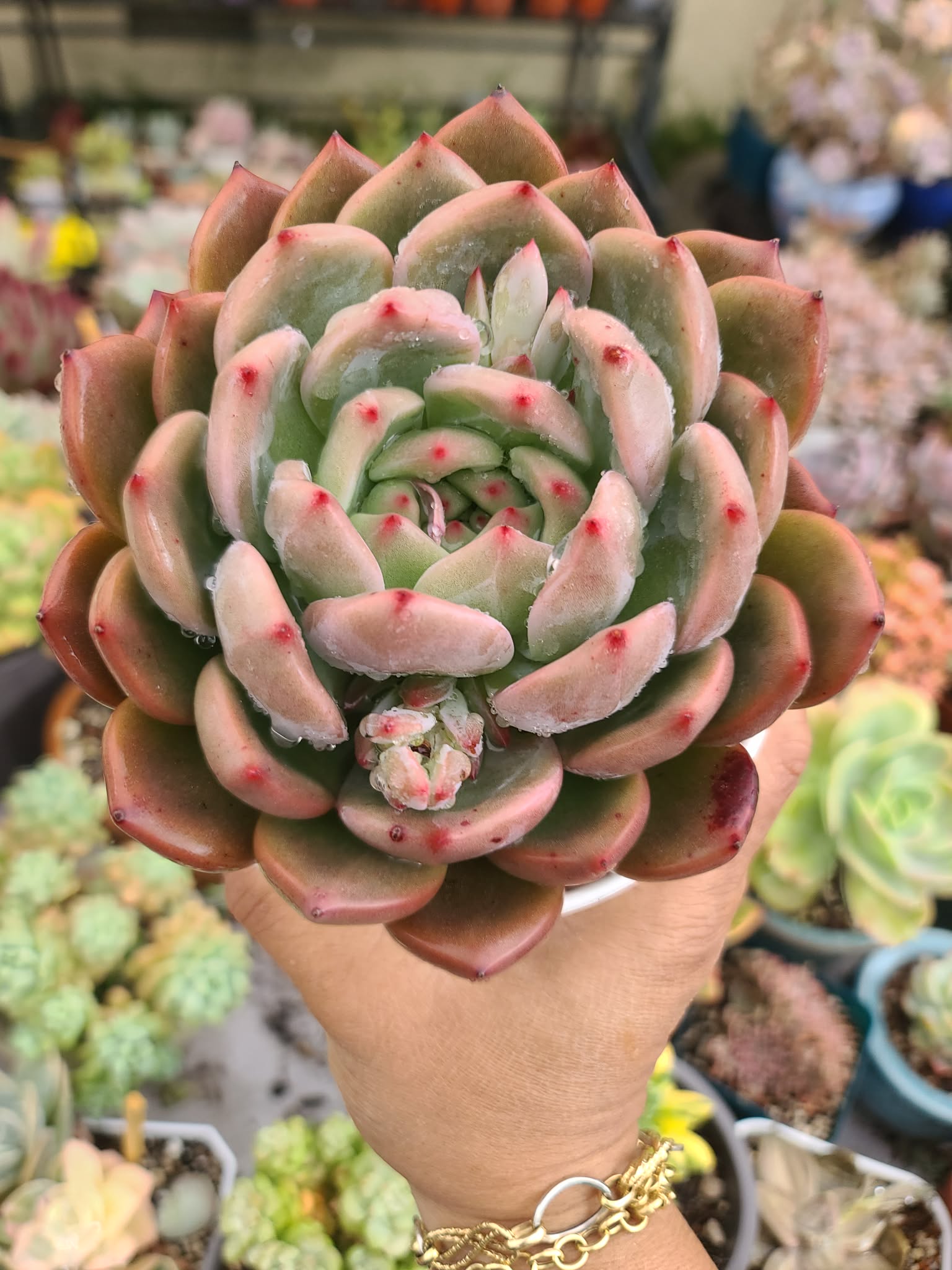 Echeveria Sharmon is a charming rosette succulent with plump, smooth leaves that often blush in soft pink and peach tones. Its compact shape and gentle colors make it a lovely addition to any succulent collection.
