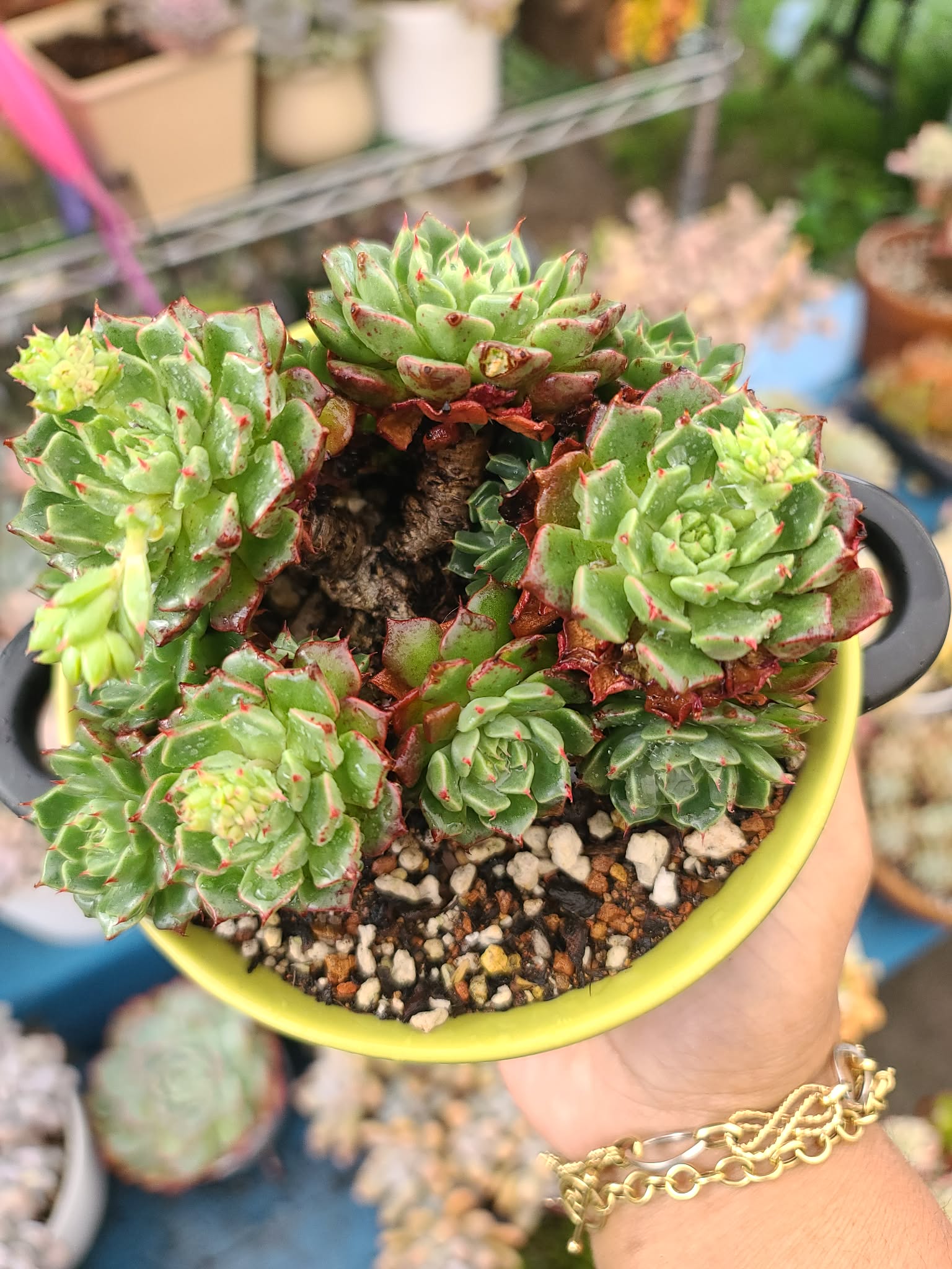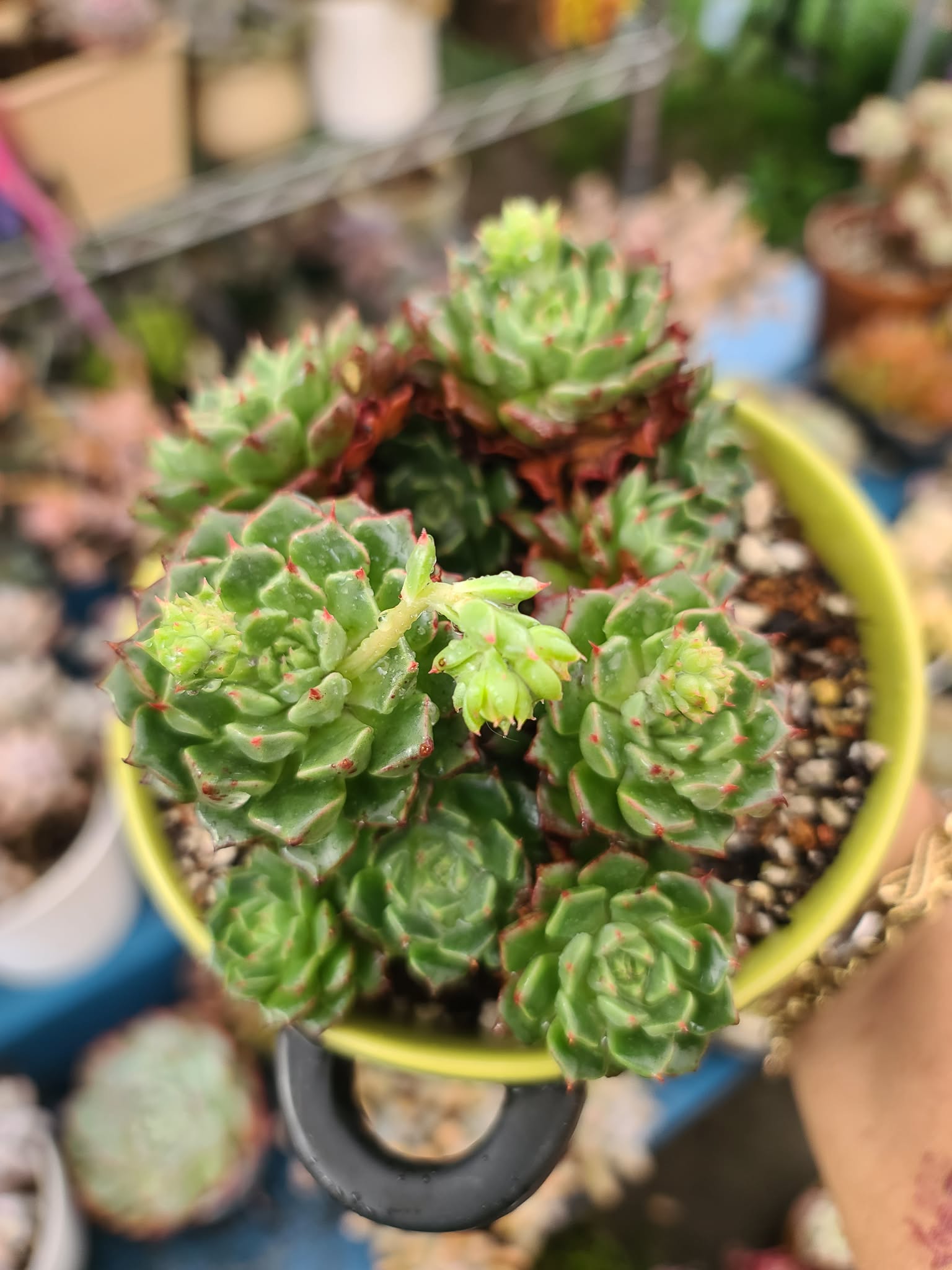 A compact clustering succulent with tight rosettes of pointed green leaves edged with tiny red tips. It forms multiple offsets, creating a full, mound-like look, and occasionally sends out delicate flower stalks—giving it a vibrant, lively charm perfect for small pots or arrangements.